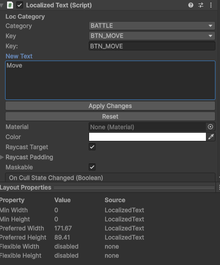 The reason I started to do this was that I finally hit a higher Text area with the end of battle screen and thought before I dive too far into it I better get the localization in place. I then took a pass at all the existing texts like the actions menu and changed those to translation lookups as well. In Unity I created a wrapper component based off the TMP Text component that extends it to tap into my localization manager to add a dropdown for localization category and then a dropdown populated with all the existing keys. If they key doesn't exist, you can modify the key text and it creates a new button for ADD KEY if the key isn't in the Database already. Next it allows for the text content of the english value for that key. You can then click apply below the text if it doesn't match the existing database entry for that key. Later on once the game is near completion I can have the localization completed for the data and then test the game for translation bugs that occur where text overflows boxes once translated or looks off. This is normal from my previous experiences.